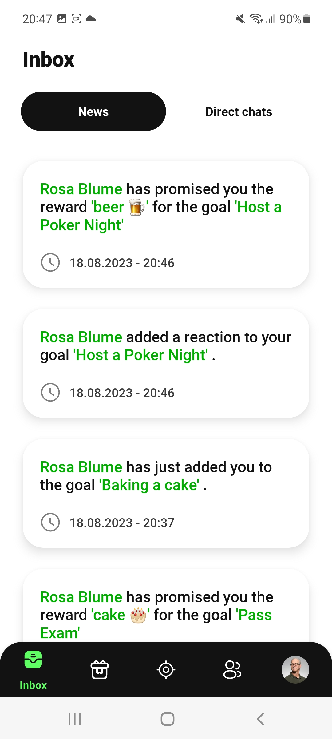 To achieve your goals, your friends can support you in different ways: Through motivational comments or offers of help in chat, likes and emojis, or promises of rewards for reaching your goals. Of course, you can do all this with your friends' goals, too...