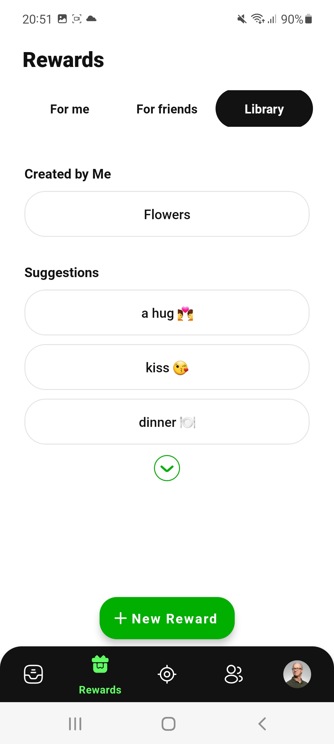 With "+ New Reward" you can create new rewards for friends (or yourself). These are also saved in the library, where you can also find suggestions.