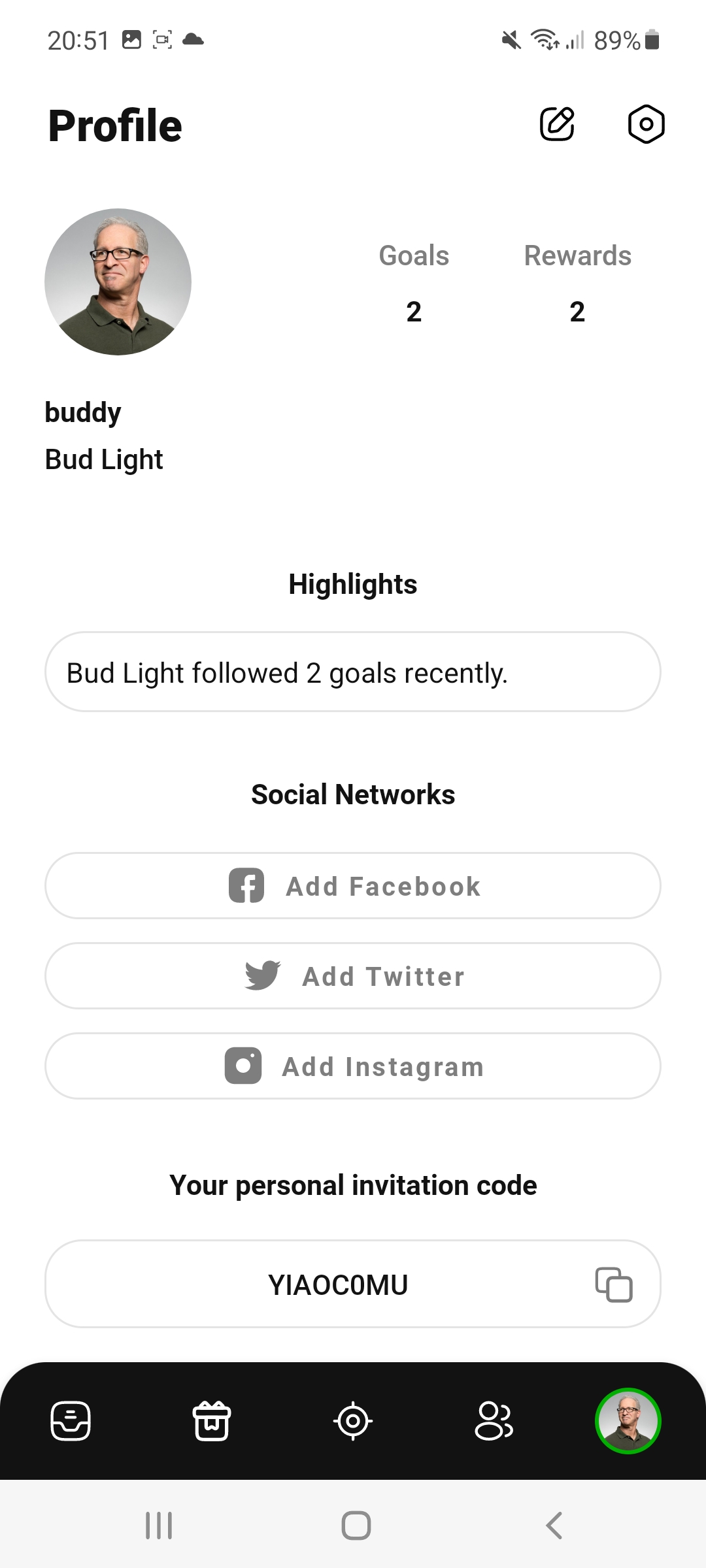 In your profile, you can also specify external social media connections and send a personal invitation code to invite friends (not mandatory). You can edit your profile at any time and customize your Goalship in the "Settings", read the privacy policy and terms and conditions, or if you don't like it, you can leave the app (which also deletes all your data).