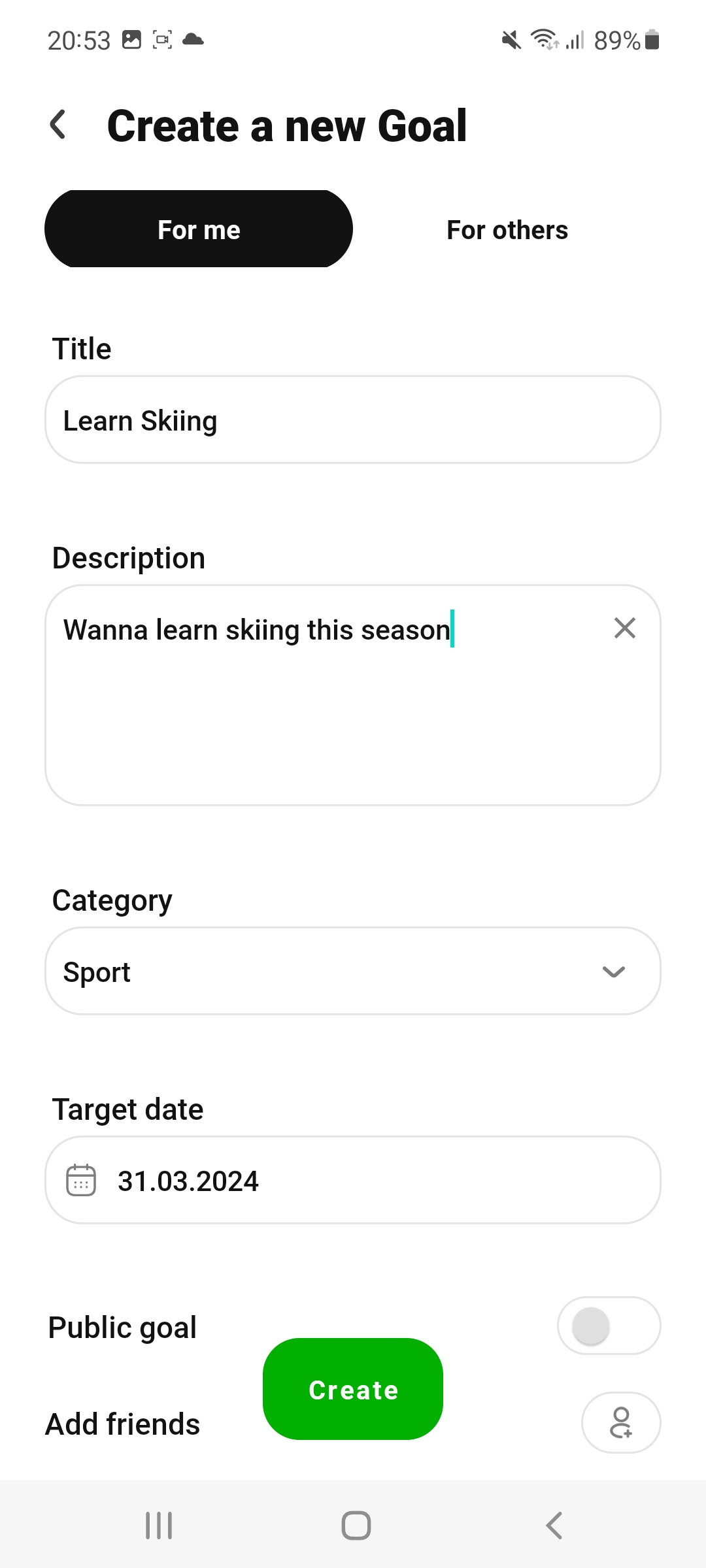 You can create your goal with title, description, category, deadline, photo and keywords and invite friends to join. You can change or discard your goal at any time or make it "publicly" visible to the Goalship community if you think it is relevant enough.