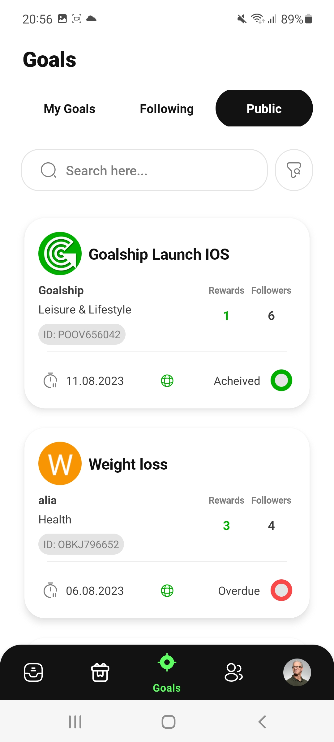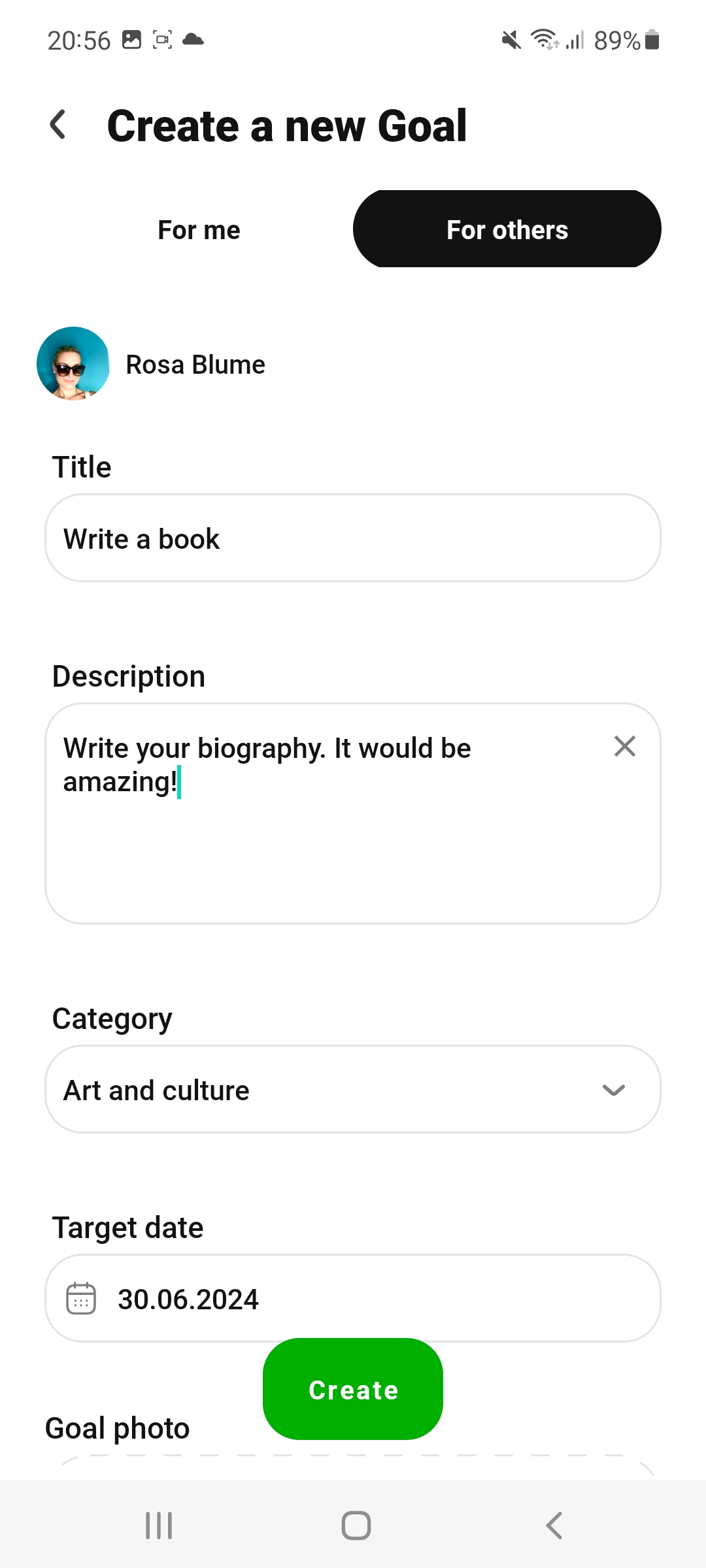 Download the Goalship app for free from an app store onto your cell phone and register as a user with your cell phone number. Then you can enter your first goal (or several) with a meaningful title (header) in one of the selection categories and publish it with information, photos, deadline, etc.